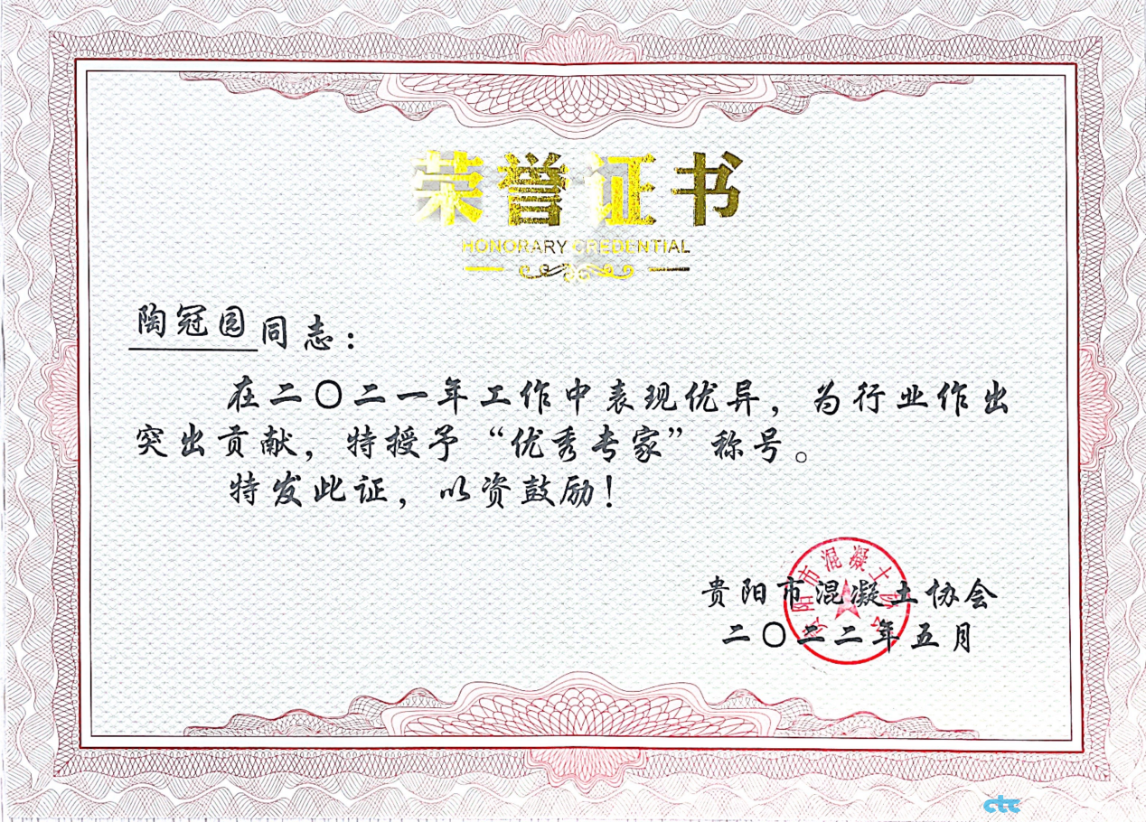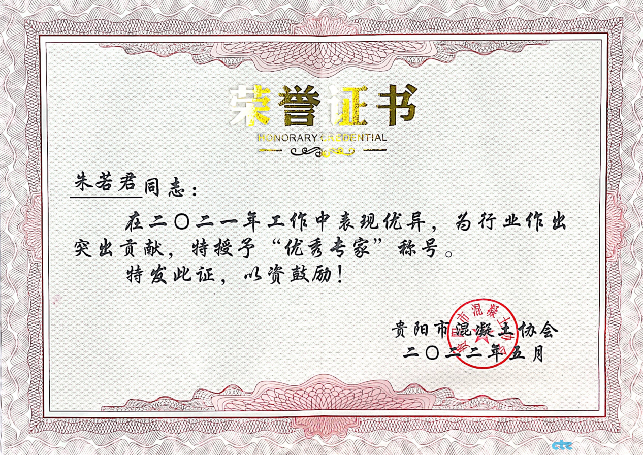 2022年5月30日下午,由貴陽市混凝土協會召開的貴陽市預拌混凝土行業實驗等級評定工作總結會上,我司員工朱若君、陶冠園在參與貴陽市混凝土企業專項實驗室等級評定工作中被貴陽市混凝土協會授予“2021年度優秀專家”榮譽稱號。